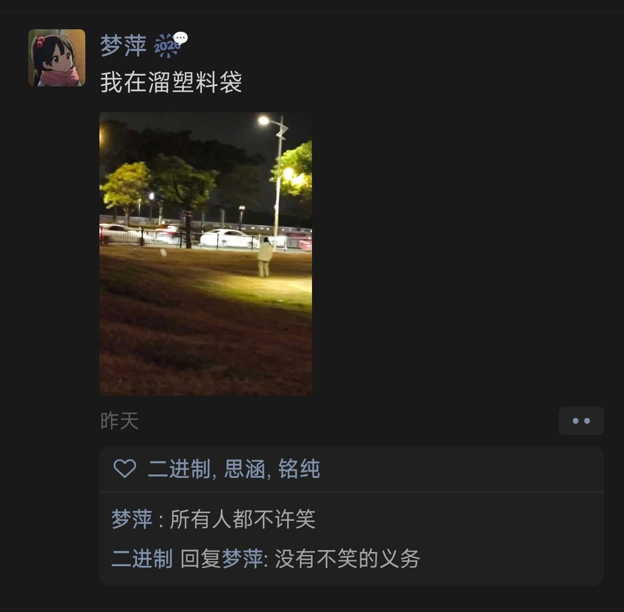 新年快乐! 整理一下最近发生的事吧! ## 春联 上周五(25-12/26)语文老师带我们写春联,本来想写一对春联的但根本想不出有啥诗句,最后就写了对“鞠躬尽瘁”"蜡炬成灰泪始干"~(也没人会贴这种春联吧),最后贴两幅在这晾晾   不过周五我们写完春联后好多班学我们写春联,语文老师还说“他们抄袭我们” ## 跨年 ### 万象城 然后就是昨天跨年吗,人真的多得离谱   跑去华硕的店拍了显卡(不过应该是空盒子)  人太多了骑车跑去小公园,路上经过一个公园,当时刚好朋友圈梦萍发了一张照片 又看到那儿有一群人。这公园我还挺熟的,看这张背景就在猜是不是她们。 ### 小公园 然后就跑去小公园玩了,拍了点照片。   小公园亭以前还能进去坐,现在变景区后还不让了丫的 ### 公园 小公园逛完了,又跑回刚才那个公园,想确认究竟是不是她们。我就就近停车,让后摸黑跑进去,尽量降低自己的身子,先是跑到那个公共厕所里,被路灯照到就用手挡住向她们方向的脸,然后在跑出来,跑到一个离她们特别近的一个坡上,没跑好摔了一跤,只好躲在坡上一棵树的后面。这一跤摔的是真的疼,缓了好一会才起身。然后接着想办法接近,躲到树后边听声音确认。不过我这耳朵真不太好用,没听出来就只好放弃。走到离他们比较远的一个坡休息,最后骑车跑了。下面附一张比较接近的后标的路径图。 ### 在万象城跨年 最后0点前的倒计时还是跑去万象城了,那路上真的一堆人根本没办法往后退,我又不是很想往前面去跟人家挤一起(感觉很危险,真出事了跑都跑不了),等到0点一到满天飞满了气球 随后去星巴克拿咖啡(平生第一次喝星巴克,足足33rmb呀!!) ### 二访公园 看到她们齐刷刷在朋友圈发照片,最终去确定一定是她们,立马骑车赶回那个公园拍照片。  然后发了个朋友圈  哈哈! Loading... 新年快乐! 整理一下最近发生的事吧! ## 春联 上周五(25-12/26)语文老师带我们写春联,本来想写一对春联的但根本想不出有啥诗句,最后就写了对“鞠躬尽瘁”"蜡炬成灰泪始干"~(也没人会贴这种春联吧),最后贴两幅在这晾晾   不过周五我们写完春联后好多班学我们写春联,语文老师还说“他们抄袭我们” ## 跨年 ### 万象城 然后就是昨天跨年吗,人真的多得离谱   跑去华硕的店拍了显卡(不过应该是空盒子)  人太多了骑车跑去小公园,路上经过一个公园,当时刚好朋友圈梦萍发了一张照片 又看到那儿有一群人。这公园我还挺熟的,看这张背景就在猜是不是她们。 ### 小公园 然后就跑去小公园玩了,拍了点照片。   小公园亭以前还能进去坐,现在变景区后还不让了丫的 ### 公园 小公园逛完了,又跑回刚才那个公园,想确认究竟是不是她们。我就就近停车,让后摸黑跑进去,尽量降低自己的身子,先是跑到那个公共厕所里,被路灯照到就用手挡住向她们方向的脸,然后在跑出来,跑到一个离她们特别近的一个坡上,没跑好摔了一跤,只好躲在坡上一棵树的后面。这一跤摔的是真的疼,缓了好一会才起身。然后接着想办法接近,躲到树后边听声音确认。不过我这耳朵真不太好用,没听出来就只好放弃。走到离他们比较远的一个坡休息,最后骑车跑了。下面附一张比较接近的后标的路径图。 ### 在万象城跨年 最后0点前的倒计时还是跑去万象城了,那路上真的一堆人根本没办法往后退,我又不是很想往前面去跟人家挤一起(感觉很危险,真出事了跑都跑不了),等到0点一到满天飞满了气球 随后去星巴克拿咖啡(平生第一次喝星巴克,足足33rmb呀!!) ### 二访公园 看到她们齐刷刷在朋友圈发照片,最终去确定一定是她们,立马骑车赶回那个公园拍照片。  然后发了个朋友圈  哈哈! 最后修改:2026 年 01 月 01 日 © 允许规范转载 赞 1 如果觉得我的文章对你有用,请随意赞赏
